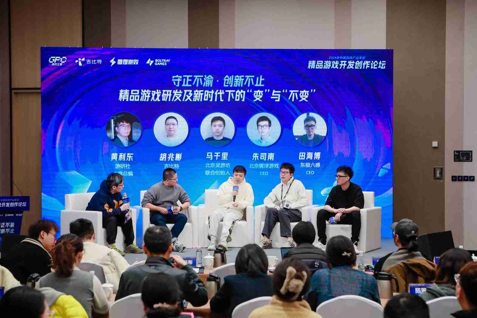 圆桌对话环节,,在游研社内容总编黄利东的主持下,,,,LEWIN乐玩CTO胡兆彬、、、、北京灵游坊联合创始人马千里、、、、北京猩球游戏CEO朱司南、、东极六感CEO田海博等四位嘉宾围绕“守正不渝、、、、创新不止——精品游戏研发及新时代下的‘变’与‘不变’”这一主题分享了各自在精品游戏开发理念及工程能力搭建方面的见解和经历,,,,并就行业变化下游戏人需要坚守的理念等展开交流探讨。。。