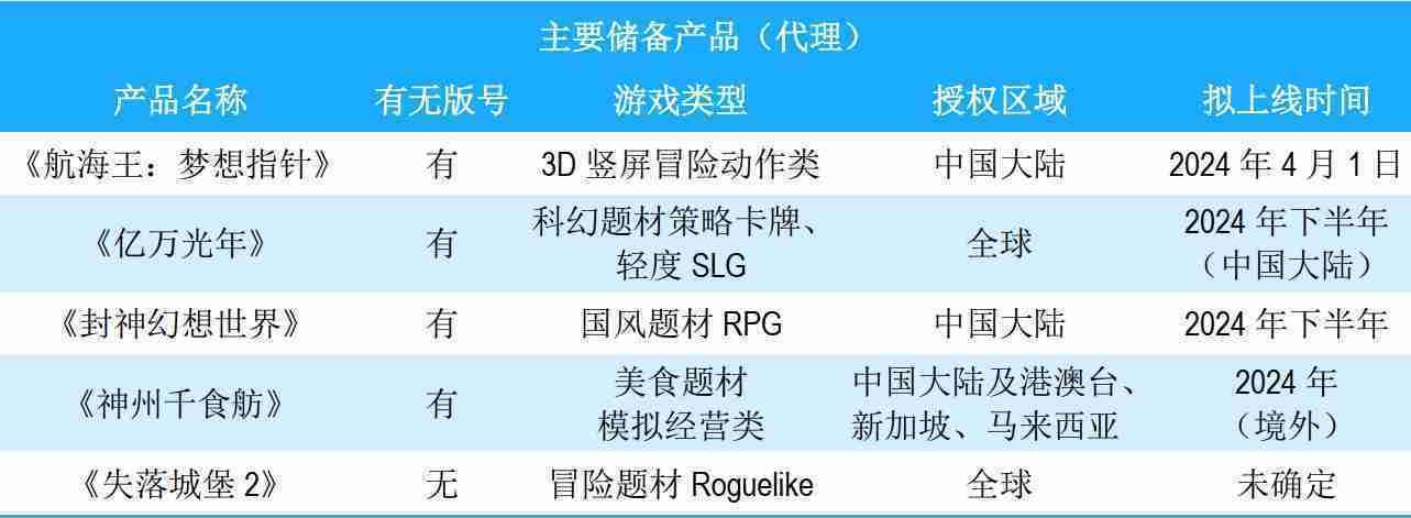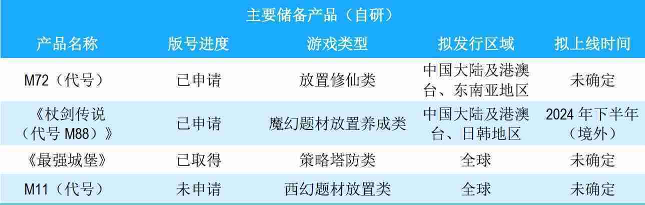 公司储备的多个自研、、代理产品都在有序推进当中,,,,涵盖放置类、、策略类、、模拟经营类、、、RPG、、Roguelike等多元化游戏品类,,,,储备的主要自研和代理产品如下::::